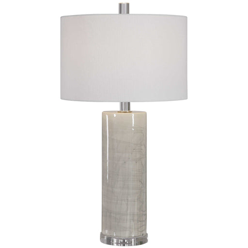 Modern In Design, This Ceramic Table Lamp Showcases A Neutral Beige Glaze With An Abstract Gray Drip Pattern, Paired With Elegant Crystal Details A...