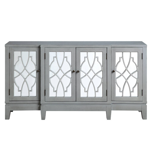 Design Features: The Magdi Antique Gray Finish Console Cabinet boasts a stylish design with 4 mirror-front doors and patterned detailing. It stan...