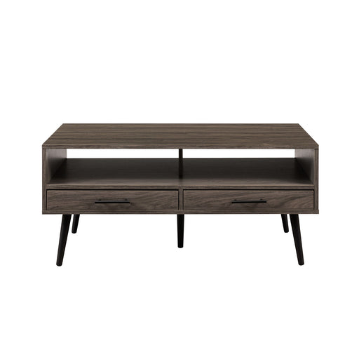 Clean lines and rich finish create a mid-century modern look Open and closed storage Beveled front edges for visual intrigue and a boxy appearance...