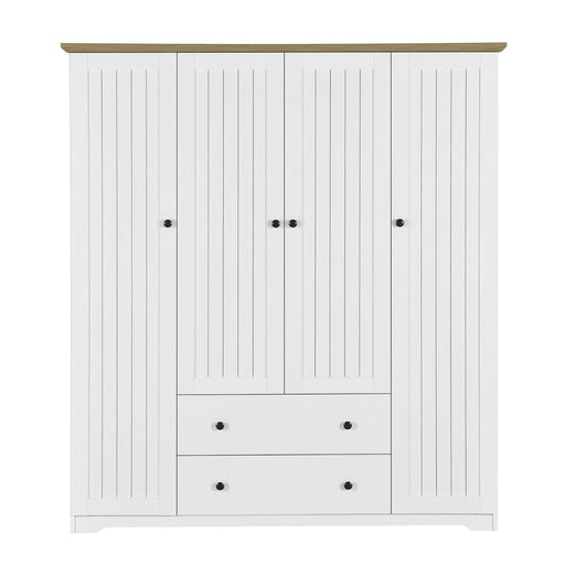 This wardrobe offers two stylish color options: white + natural wood and black + natural wood. The white version has six doors and four drawers, wi...