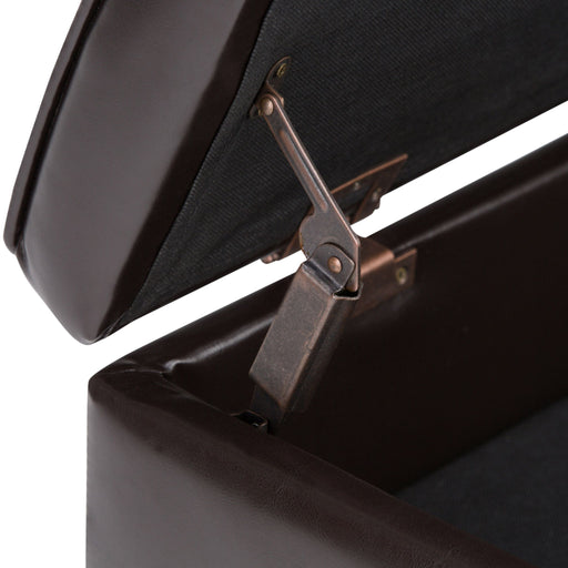 Hand constructed using solid wood, plywood, foam Upholstered with a durable Tanners Brown Vegan Faux Leather Features lift up lid with child safet...