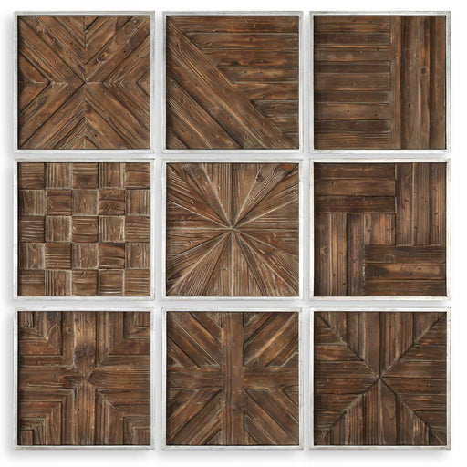 A Collage Of Unique 3-dimensional Pieced Patterns Of Rustic Distressed Fir Wood, Framed In Silver Leaf. Bryndle - Rustic Wooden Squares (Set of 9) ...