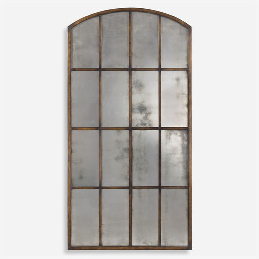 This Oversized Arch Features A Forged Iron Frame In A Hand Applied Warm Bronze Finish With Burnished Distressing Encasing An Antique Style Mirror.P...