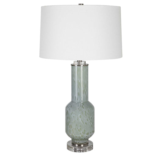 This Sophisticated Lamp Displays A Unique Bubble Glass Base In Tranquil Aqua Gray With Plated Brushed Nickel Accents And Thick Crystal Details. Tap...