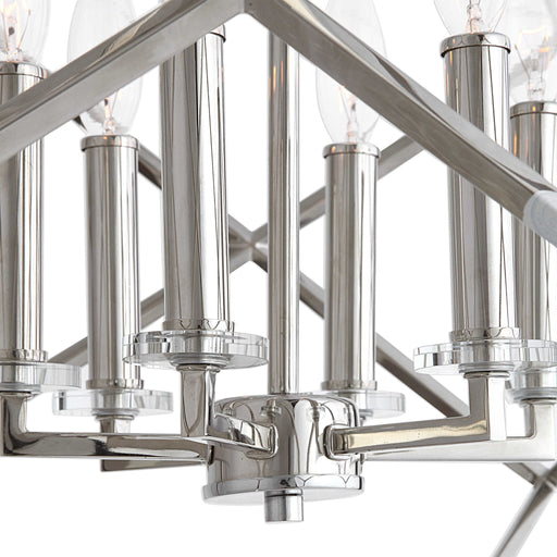 An Elegant, Polished Nickel Cube Interlocked With Its Twin, At The Center Of Their Intersection Is A 6 Light Candle Cluster With Mini Crystal Bobec...