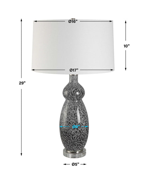 This Curvy Glass Base Features A Soft Gray Background With Mottled Black Details Displayed On A Thick Crystal Foot With Plated Brushed Nickel Accen...