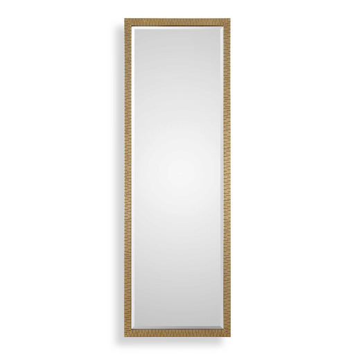 Thick Iron Frame Featuring Alternating Laser Cut Grooves, Finished In A Lightly Antiqued, Metallic Gold Leaf. Mirror Has A Generous 1 1/4" Bevel An...