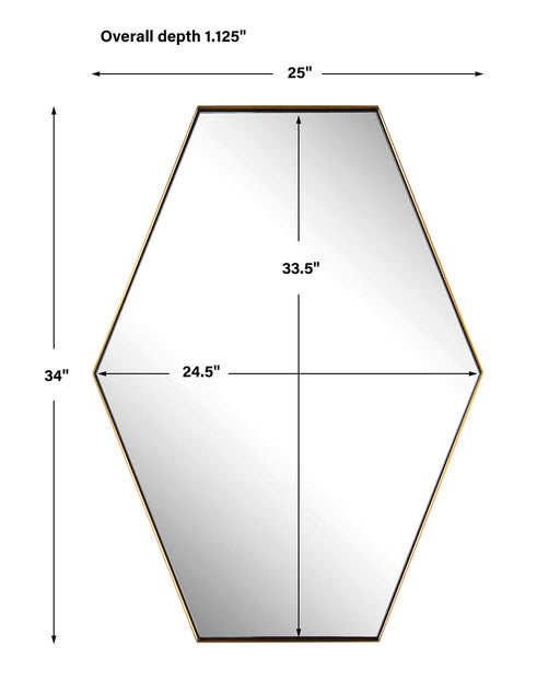 This Hexagon Mirror Features A Contemporary Style Using A Stainless Steel Frame Finished In A Plated Brushed Brass, Surrounding A Floating Style Po...