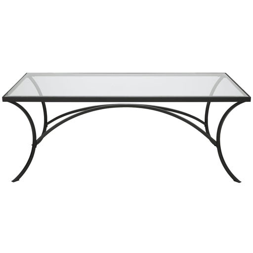 Gracefully Arched Hand Forged Metal Finished In Sleek Satin Black. Top Is Clear Beveled Tempered Glass.Product FeaturesDesigner: Matthew Williams A...