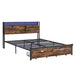 Queen Size Metal Platform Bed Frame With Wooden Headboard USB Charging Station 2 Drawers - Black Brown