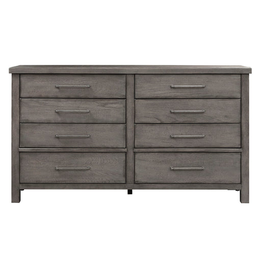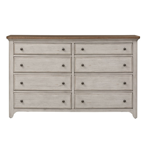 Enjoy the combination of modern and farmhouse with this 8-drawer dresser. Accented by heavy distressing, clean lines and washed brass hardware. Sto...