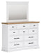 Casual style with substance. This two-tone dresser with mirror raises the bar on comfortably cozy design in your soothing sanctuary. A sturdy silhouette with a classic white finish and black metal hardware exudes modern farmhouse vibes. The butcher block oak veneer top adds a relaxed aesthetic. And this charmingly curated piece is spacious enough for all your essentials.