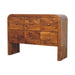 - Darcy 3 over 3 Drawer Chest in Chestnut Finish - Exuding timeless elegance with a contemporary touch, this handcrafted 100% Solid Mango Wood chest of drawers showcases a stunning curved silhouette in a rich chestnut finish. Designed for both style and function, it features 3 over 3 drawers adorned with brass knobs, offering ample storage for organizing essentials while adding a sophisticated charm to your space. The smooth, rounded edges enhance its seamless appeal, making it a perfect addition to bedrooms, hallways, or living areas. Built for durability and sustainability, this artisanal piece blends practicality with refined craftsmanship, elevating any interior with its warm, natural beauty.