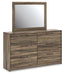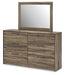 Casually cool style and lots of storage go hand in hand with this dresser and mirror. A weathered brown finish over replicated oak grain creates an easygoing vibe, setting the scene in your restful retreat. Clean lines and modern handles provide a fuss-free look. And the dresser's six roomy drawers give you plenty of space for stowing away clothes and more.