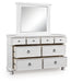 | Details | Includes dresser and mirror, Dresser made with hardwood solids, veneers and MDF substrates , Mirror made with solid wood, Rubbed antiqued white finish, Metal hardware with pewter-tone finish, 8 smooth-gliding drawers with fully finished interiors, French/English dovetail construction and heavy-duty ball-bearing side glides, Top drawers felt lined, Mirror attaches to back of dresser | |