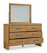 | Details | Includes dresser and mirror, Made with hardwood solids, mango wood veneer and MDF substrate, Light wood-tone finish, 6 smooth-gliding drawers with fully finished interior, dovetail construction and heavy duty ball-bearing side glides (top drawers felt lined) , Metal drawer pulls with darkened bronze-tone finish, Mirror attaches to back of dresser | |