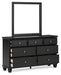 | Details | B687B4: Includes full panel headboard, footboard and rails, Made with hardwood solids, birch veneer and MDF substrate, Black painted finish, Thick profiled tops, Tapered feet, Foundation/box spring required, sold separately, Mattress available, sold separately, Assembly required, Bed is compatible with an adjustable base, B687B1: Includes dresser and mirror, Made with hardwood solids, birch veneer and MDF substrate, Black painted finish, 7 smooth-gliding drawers with dovetail construction and ball-bearing side glides, Round metal drawer knobs with satin nickel-tone finish, Framed drawer fronts, Tapered feet, Mirror attaches to back of dresser, Assembly required, | |