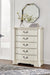 Details B980B4: Includes headboard, footboard and rails, Made with hardwood solids, spruce veneer, MDF substrates and cast resin components , Antiqued white painted finish, Polyester upholstery, Button tufting, Foundation/box spring required, sold separately, Mattress available, sold separately, Assembly required, B980B1: Includes dresser and mirror, Made with hardwood solids, spruce veneer, MDF substrates and cast resin components, Antiqued white painted finish, 9 drawers with fully finished interiors, French and English dovetail construction and ball-bearing side glides, Metal bar pulls with aged pewter-tone finish, Mirror attaches to back of dresser, B980-46: Made with hardwood solids, spruce veneer, MDF substrates and cast resin components, Antiqued white painted finish, 5 drawers with fully finished interiors, French and English dovetail construction and ball-bearing side glides, Metal bar pulls with aged pewter-tone finish, B980-93: Made with hardwood solids, spruce veneer, MDF substrates and cast resin components, Antiqued white painted finish, 3 drawers with fully finished interiors, French and English dovetail construction and ball-bearing side glides, Metal bar pulls with aged pewter-tone finish, 110V power supply with dual USB charging ports, Power cord included; UL Listed,