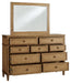 | Details | B895B6: Includes upholstered panel headboard, footboard, rails and slats, Made with hardwood solids, hickory veneer and MDF substrates, Light brown wood-tone finish, Polyester upholstery, Foundation/box spring required, sold separately, Mattress available, sold separately, Assembly required, B895B1: Includes dresser and mirror, Made with hardwood solids, hickory wood veneer and MDF substrates, Light brown wood-tone finish, Dark bronze-tone drawer pulls, 9 drawers with fully finished interior, dovetail construction and heavy duty ball-bearing side glides (top drawers felt lined), Mirror attaches to back of dresser, | |
