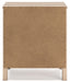 Details Made with engineered wood (MDF/particleboard/plywood) and decorative laminate for the right balance of affordability and durability, Two-tone finish (dry, light finish over replicated oak grain; light chevron pattern), Decorative laminate replicates natural or man-made material surfaces with consistent color, pattern and texture, Dark-colored hardware, 2 smooth-gliding drawers with ball-bearing side glides; vinyl-wrapped sides and back for durability, Assembly required