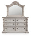 | Details | PCB948B5: Includes upholstered panel headboard, footboard, rails and slats, Made with hardwood solids, oak and ash swirl veneers, MDF substrates and cast resin components, Side rails feature laminated solid hardwood slat support rails (or LVL) with glued and screwed blocking for added strength, Antiqued white finish, Polyester upholstery, Foundation/box spring required, sold separately, Mattress available, sold separately , Assembly required, PCB948B1: Includes dresser and mirror, Dresser made with hardwood solids, oak and ash swirl veneers, MDF substrates and cast resin components, Mirror made with solid wood, Antiqued white finish, Hardware with antiqued bronze-tone finish, 6 smooth-gliding drawers with fully finished interiors, English dovetail construction and heavy-duty ball-bearing side glides (top drawers felt lined), Mirror attaches to back of dresser, | |