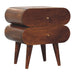 • Bubble Chestnut Nightstand - This quirky nightstand boasts a round capsule-style design on both drawers. It is crafted from 100% solid mango wood in a warm chestnut finish, and it is both durable and stylish. Supported by Nordic-style legs, this table features a modern aesthetic and a shiny brass knob on each drawer.