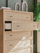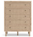 Clean-lined and contemporary—but far from stark—this chest of drawers is a fresh style awakening. Pairing a light finish with replicated oak grain and textured beige details that replicate the look of cane, its mixed materials bring a naturally versatile vibe to your bedroom. Sleek, simple hardware plays perfectly with the modern aesthetic. Prepare to have your mind blown by the vast universe of possibilities that await within the spacious drawers.