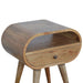 - Circular Open Nightstand - This round style nightstand has been constructed from 100% solid mango wood and has one drawer with an open slot, perfect for storing or displaying any bits and pieces before bedtime. It has been constructed from 100% solid mango wood in a finish allowing its simple design to be partnered with any styles or finishes of furniture.
