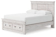 Details Includes panel headboard, storage footboard, platform rails and roll slats , Made with engineered wood (MDF/particleboard/plywood) and decorative laminate for the right balance of affordability and durability, Whitewash replicated worn through paint over replicated wood grain with authentic touch, Decorative laminate replicates natural or man-made material surfaces with consistent color, pattern and texture, Handles with dark bronze-tone finish, 2 smooth-gliding storage drawers, Bed does not require additional foundation/box spring; accommodates most zero clearance adjustable bases with the addition of a bunkie board , Mattress available, sold separately, Assembly required