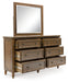 | Details | Includes dresser and mirror, Made with hardwood solids, veneers and MDF substrates, Brown finish, Oil-rubbed bronze-tone knobs, 6 drawers with fully finished interior, dovetail construction and heavy duty ball-bearing side glides (top drawers felt lined), Turned feet, Mirror attaches to back of dresser | |