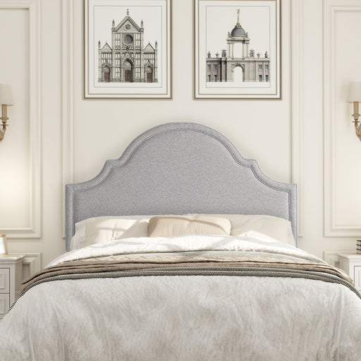 Elegant Design: The headboard features an arched top design, upholstered in a grey leather-look fabric, complemented by a silver-finish nailh...