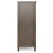- Transitional design includes shaker style doors featuring X detail in panel, bronze pulls and square tapered legs