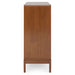 - Mid Century Modern design includes notched handles on doors, drawers and angled tapered legs