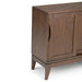 - Mid Century Modern design includes notched handles on doors and angled tapered legs
