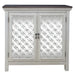Transform your home with the Westridge accent cabinet. Crafted of Eucalyptus solids and Ash veneers in a wire brushed finished gray with white dusty wax and worn wood top. Features mirrored doors with decorative floral pattern overlays, block feet and one concealed fixed shelf behind doors. A unique piece that will work with any dΓ©cor from traditional to contemporary.