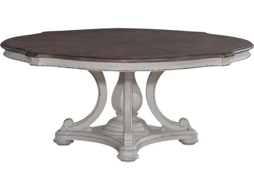 Gather the family together for dinner around the Magnolia Manor pedestal table. A 42" round is perfect for small spaces or add in the 18" leaf to e...