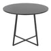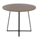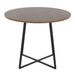 - Product Specifications: The table is fixed at dining height with a round wooden top and black metal base. It is intended for indoor use only, with a weight limit of 100 lbs, and requires assembly.