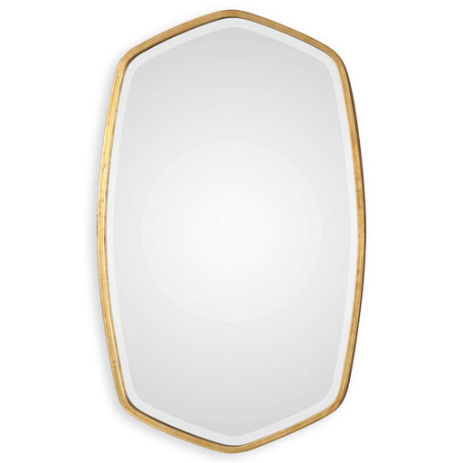Contemporary In Style, This Mirror Features A Sleek Iron Base With Linear Metal Accents. The Piece Is Finished In Gold Leaf With Four Round Beveled...