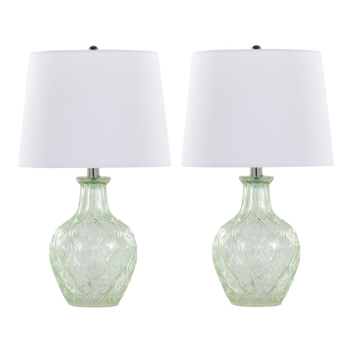 Elegant Design: The Gloria Accent Table Lamp features a sleek glass jug-shaped base with a textured pattern, complemented by a minimal drum shade...