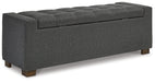 | Details | Polyester upholstery in gray, Wood legs with brown finish, Tufted seat cushion, Hinged seat, Interior storage | |