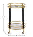 A Tasteful Bar Cart With A Round Design Ready For Effortless Placement In Any Space. Comprised Of Matte Black Iron That Perfectly Accentuates Its Soft Gold Leaf Features. Two Glass Shelves Are Ready To Showcase Any Of Your Treasured Glasses Or Drinks. Complete With Rolling And Locking Casters.
