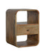 - Features: solid mango wood,oak-ish finish,round edges,1 drawer,brass knob,open slot
