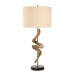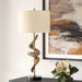 This Eye-catching Table Lamp Showcases A Sculpture Inspired By A Rams Horn Displayed Around A Plated Antique Brass Column And A Thick Black Marble Foot. A Round Hardback Drum Shade Made With An Off-white Linen Fabric Completes The Piece.