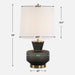 The Trentino Table Lamp Features A Striking Frosted Black Glass Base, Complemented By Lightly Antiqued Brass-plated Accents. The Tapered Round Hardback Shade Is Covered In A Crisp White Linen Fabric.