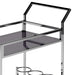 - Features Black toughened glass top and bottom shelves, one rack for hanging glasses, three rings for bottle storage, four caster wheels รขโฌโ two that lock and handle/pull