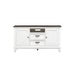 Indulge in a classic look and casual feel with the Allyson Park TV console. Crafted with pine solids and veneers with cathedral white oak veneer top, this piece can accommodate most 62" TVs and features a wire brushed finish with planked tops, full extensions drawer glides for easy access to storage, antiqued pewter knob hardware, fully stained interior drawers, square tapered feet and 1 adjustable shelf behind each door. The open compartment and wire management provisions effortlessly accommodate electronics or gaming equipment.