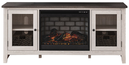 Express your modern farmhouse style with this TV stand with fireplace option. Its wispy white finish over replicated oak grain is a delightful chan...