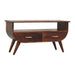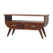 - Agra Media Unit - Introducing our eye-catching media unit, crafted from 100% solid mango wood with a chestnut finish. Its features include Nordic-style legs, shiny gold t-bar handles, and a generously sized open shelf, it's the ultimate blend of style and functionality. Elevate your living room with this essential and elegant piece.