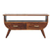 - Features: solid mango wood, chestnut finish, nordic-style legs, t-bar handles, open shelf,