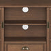 - Transitional design includes rounded molded table top, ladder framed doors, square, slightly tapered legs and antique bronze classic drawer pulls